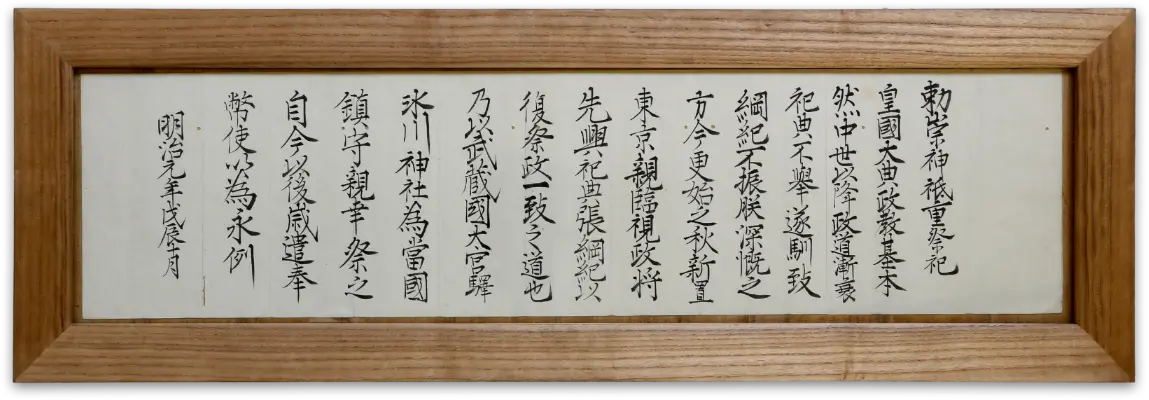 上記の「氷川神社親祭の詔(祭政一致の詔)」を賜い、勅祭の社と御定めになりました。