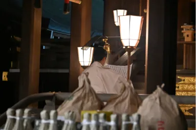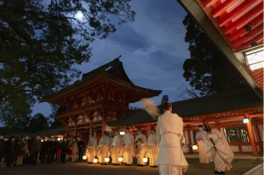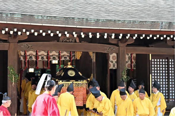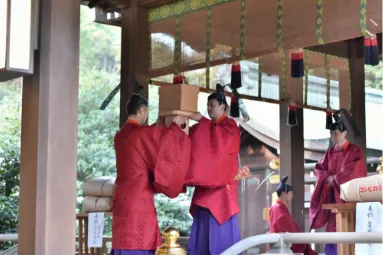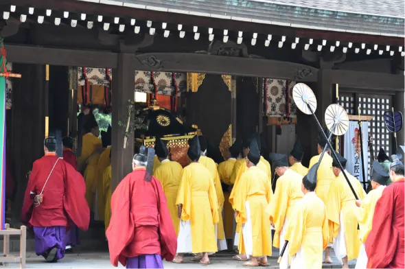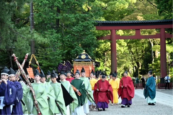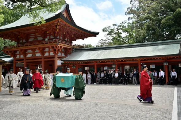 その後、同様に正装の勅使が御幣物(ごへいもつ)を捧持した随員と楽師を従え、勅使斎館より本殿へと参進します。