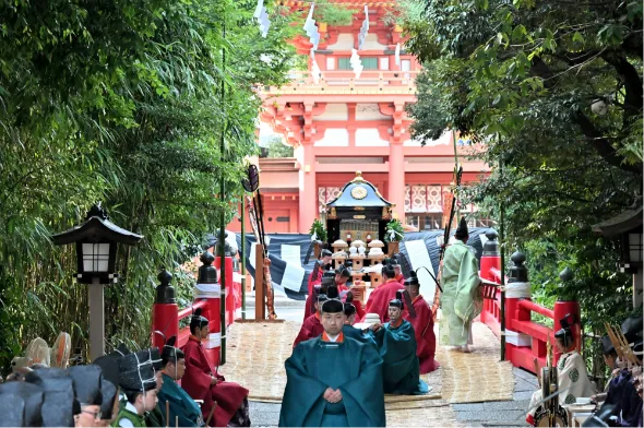正装の衣冠を着用した神職が参進します。
